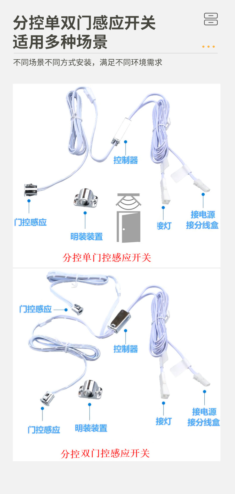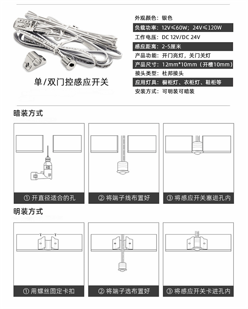 ●安全性高,响应速度快,简洁大方●小巧的开关可随意隐藏安装在顶部门板内,使用非常方便●柜门关闭后开关被遮挡灯光熄灭,反之柜门打开,灯光亮起●一个开关可同时控制多条灯光同步使用